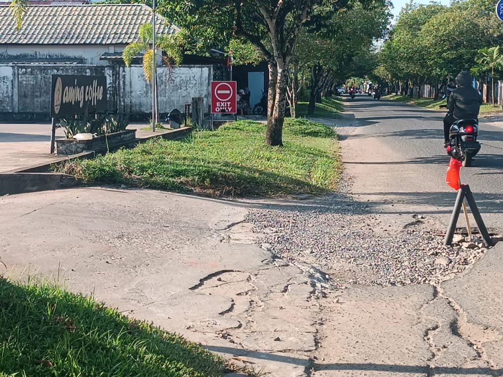 Foto : Jalan berlubang di depan pintu masuk Aming Coffee Ketapang. (Suarajurnalis.id/AS)