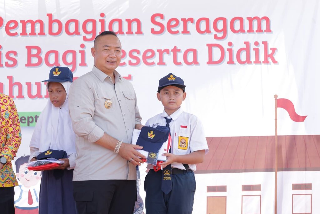 Foto : Bupati Keterangan saat memberikan bantuan seragam gratis kepada siswa SD dan SMP. (Suarajurnalis.id/AS)