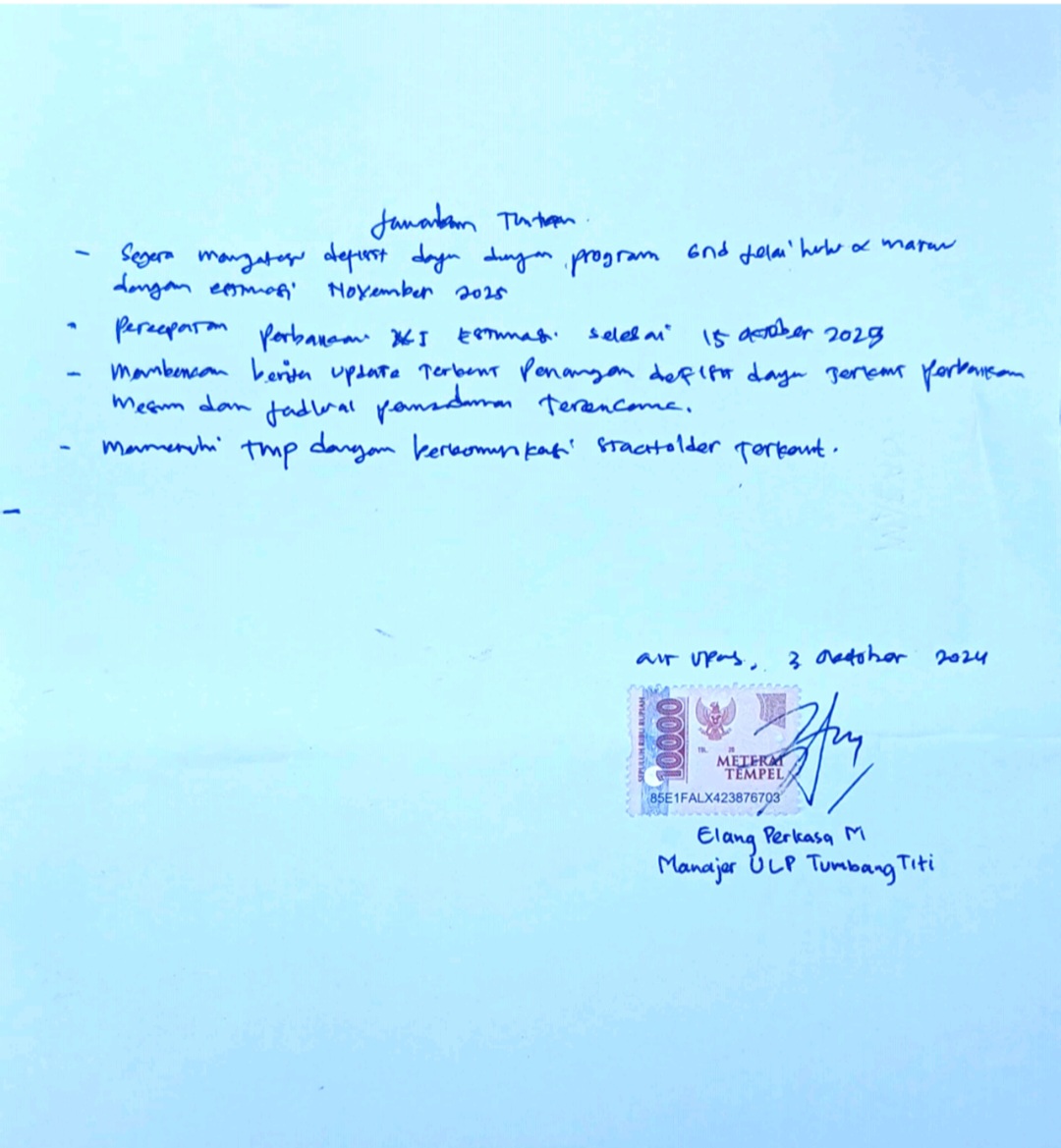 Menanggapi tuntutan tersebut, Manajer PLN ULP Tumbang Titi, Elang Perkasa M, menyampaikan beberapa langkah konkret yang akan segera dilakukan: